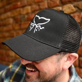 Black Beechfield brand microknit snapback trucker cap embroidered with white Ghost Whale 'tail' logo.
