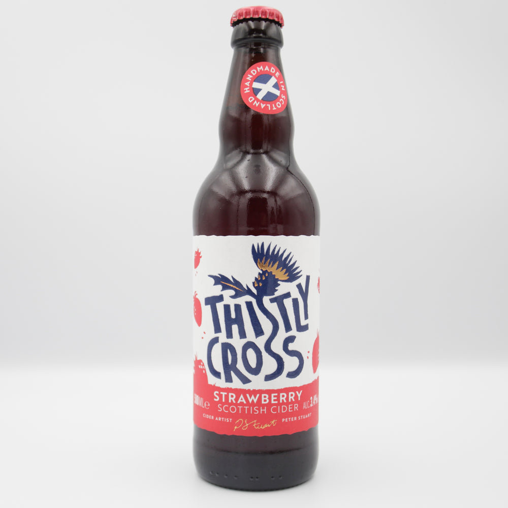 " Nossa primeira sidra de frutas, feita com morangos escoceses, cultivados na Belhaven Fruit Farm e prensados à mão em nossa prensa de maçã."